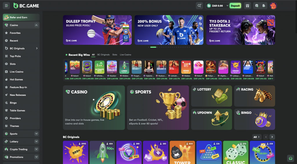 Ấn tượng đầu tiên về trang web casino crypto BC Game là tích cực, nhờ vào thiết kế hiện đại và thanh lịch với chủ đề tối. Ở bên trái màn hình, có một menu điều hướng chứa nhiều danh mục khác nhau, trong khi một banner ở trên cùng mời khách truy cập đăng ký và nhận thưởng chào mừng.